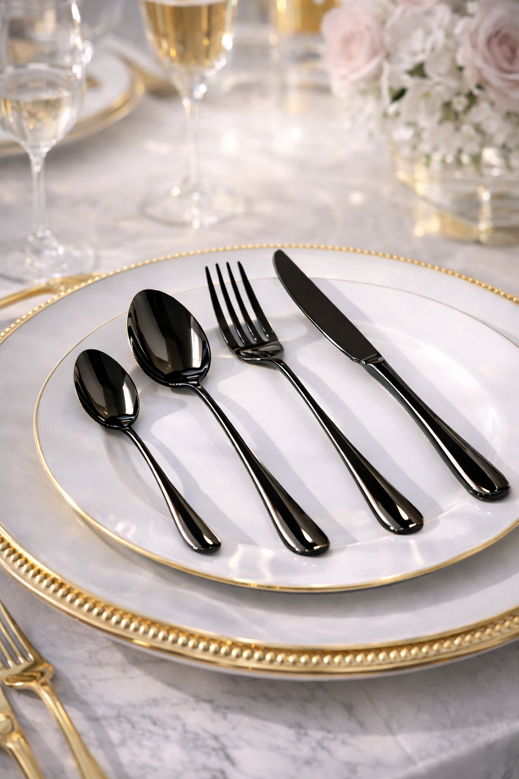Destacando sua mesa no momento de degustar refeições especiais, este faqueiro, disponível em 2 quantidades diferentes, polido e completamente revestido em nitreto de titânio preto (PVD – Physical Vapor Deposition) de alta durabilidade e antimicrobiano, é o conjunto de talheres mais funcional, prático e delicado que cumpre o que promete. Além disso, todos os seus itens possuem acabamento em alto brilho metálico, sem porosidades, evitando o acúmulo de resíduos e/ou bactérias.