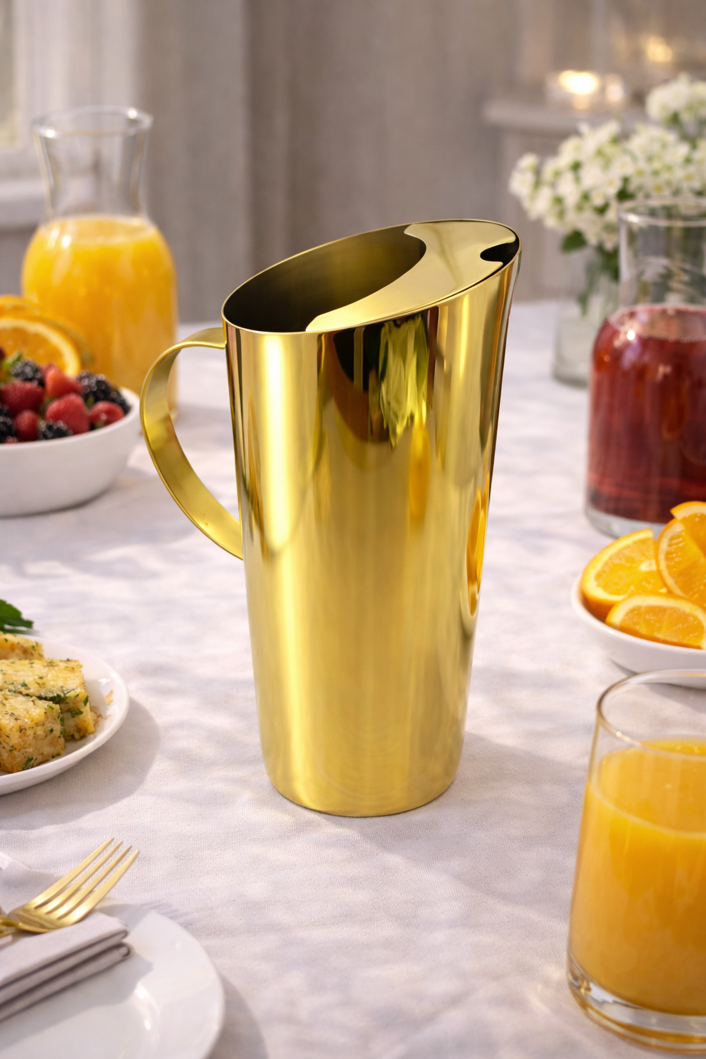 Para servir um suco com muita elegância e beleza, esta jarra, com capacidade de 1,5L, polida e completamente revestida em nitreto de titânio dourado (PVD – Physical Vapor Deposition) de alta durabilidade e antimicrobiano, é a peça mais funcional, prática e delicada que cumpre o que promete. Além disso, possui acabamento em alto brilho metálico, sem porosidades, evitando o acúmulo de resíduos e/ou bactérias.