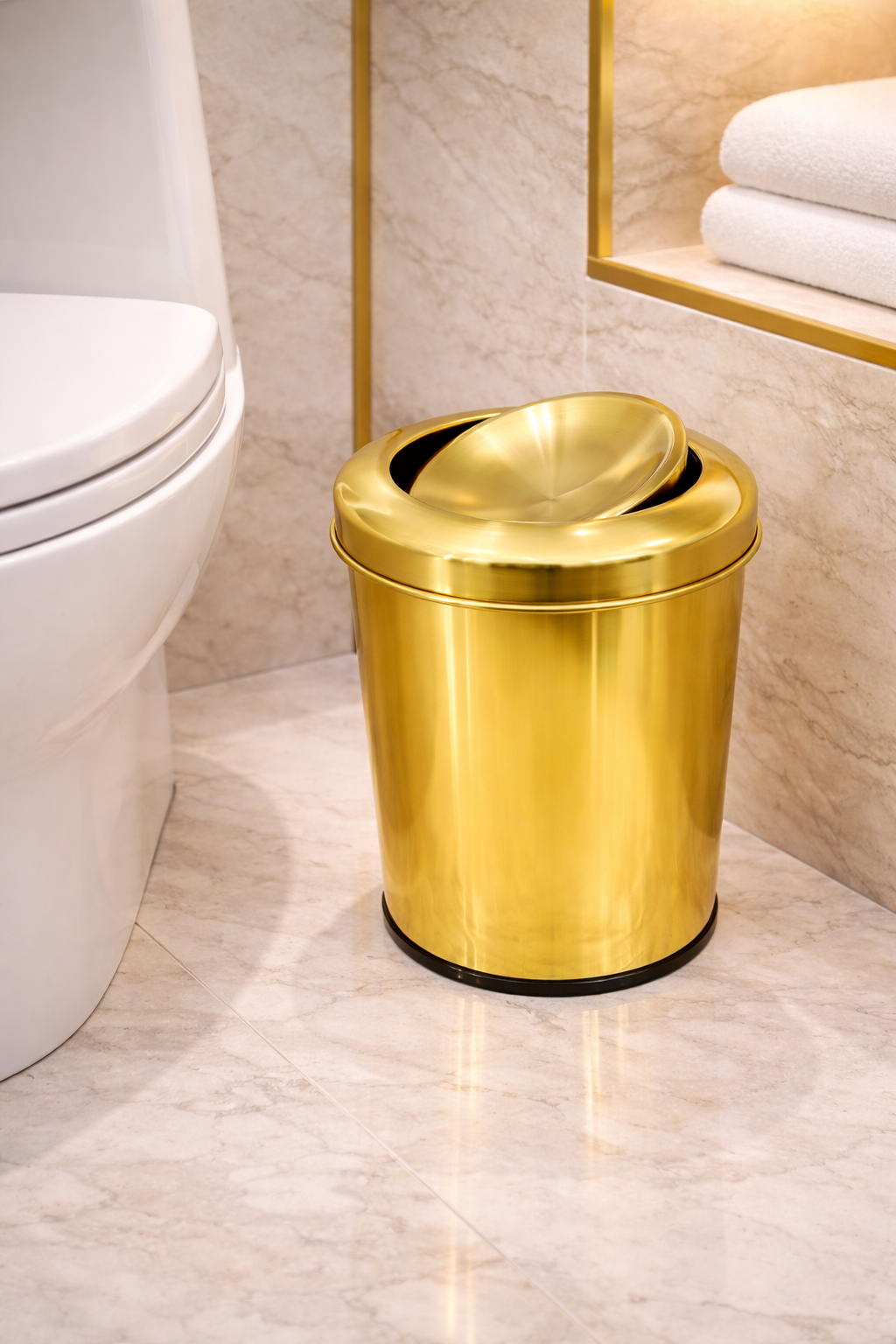 Embelezando seu ambiente, este kit de lixeiras com tampa basculante, disponível em 6 opções, polido e revestido em nitreto de titânio dourado (PVD – Physical Vapor Deposition) de alta durabilidade e antimicrobiano, é a escolha mais funcional, prática e delicada que cumpre o que promete. Além disso, seus itens possuem acabamento em alto brilho metálico, sem porosidades, evitando o acúmulo de resíduos e/ou bactérias.