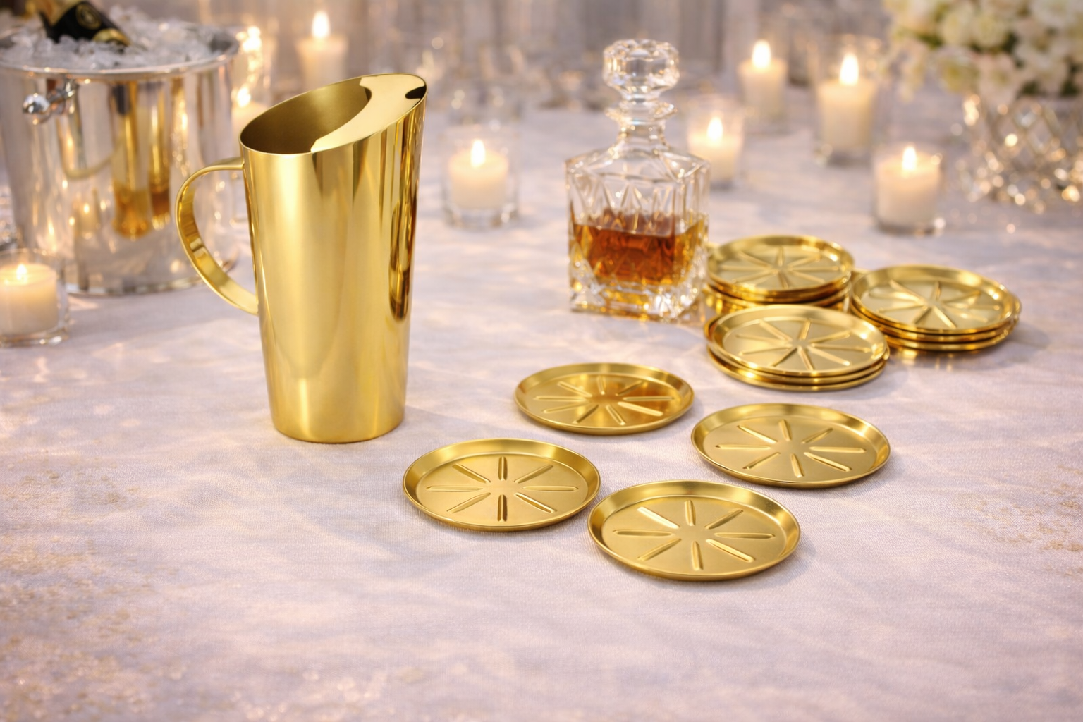 Para servir aquele suco e combinar com uma boa organização, este kit, com 7 peças polidas e completamente revestidas em nitreto de titânio dourado (PVD – Physical Vapor Deposition) de alta durabilidade e antimicrobiano, é a escolha mais funcional, prática e delicada que cumpre o que promete. Além disso, seus itens possuem acabamento em alto brilho metálico, sem porosidades, evitando o acúmulo de resíduos e/ou bactérias.