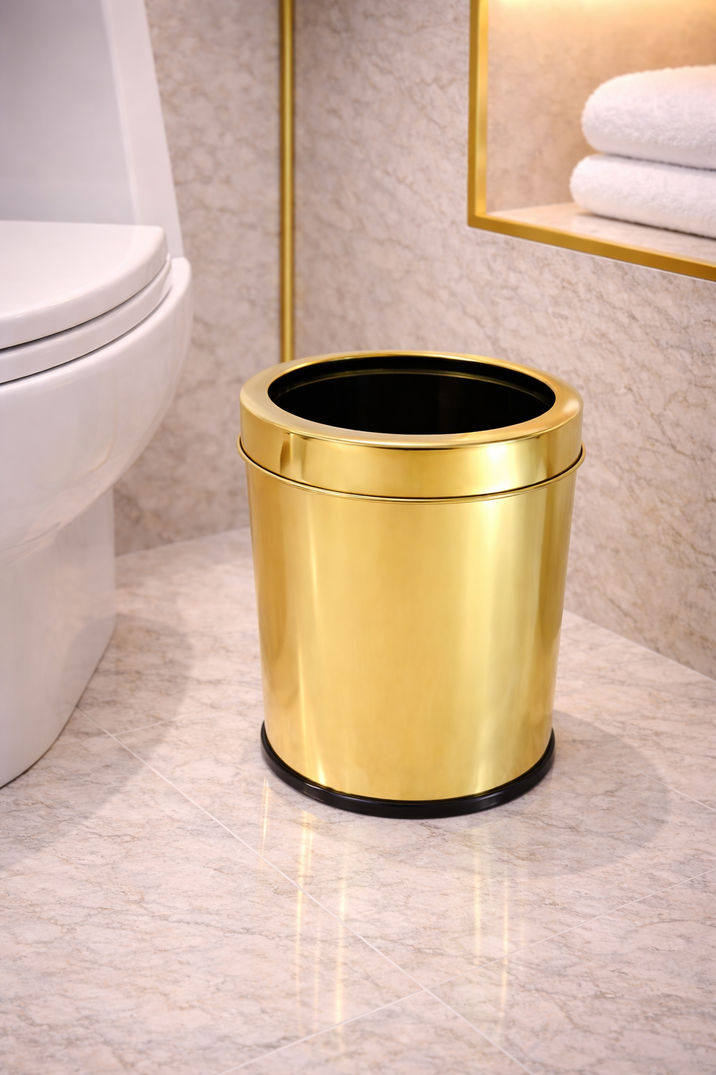 Embelezando seu ambiente, este kit de lixeiras com tampa aro, disponível em 6 opções, polido e revestido em nitreto de titânio dourado (PVD – Physical Vapor Deposition) de alta durabilidade e antimicrobiano, é a escolha mais funcional, prática e delicada que cumpre o que promete. Além disso, seus itens possuem acabamento em alto brilho metálico, sem porosidades, evitando o acúmulo de resíduos e/ou bactérias.
