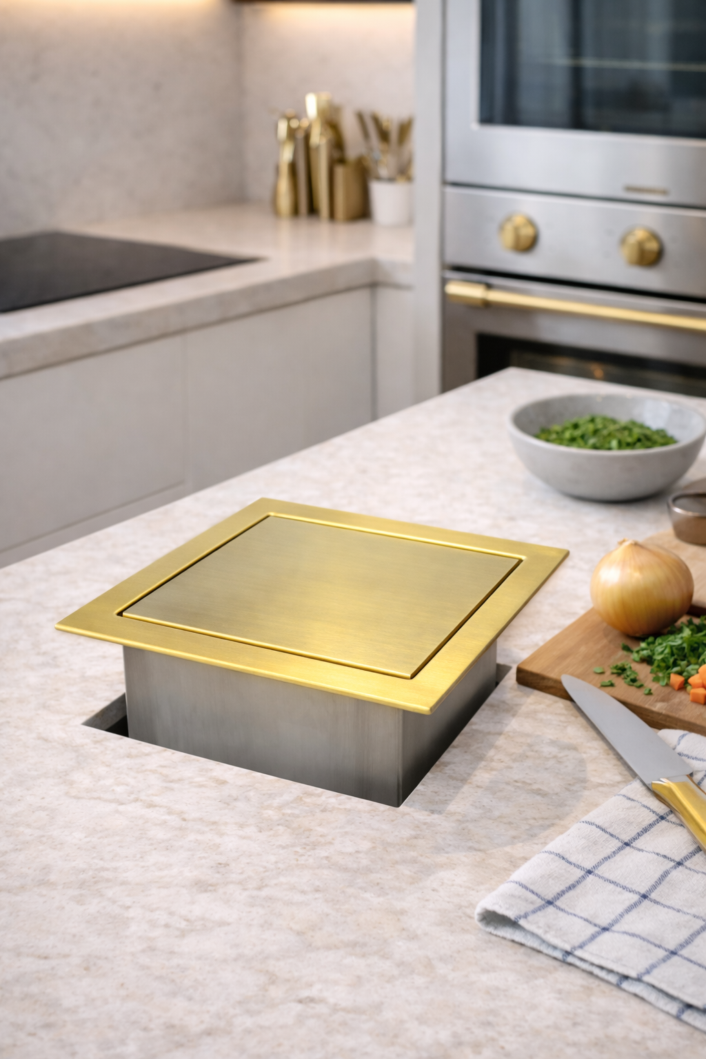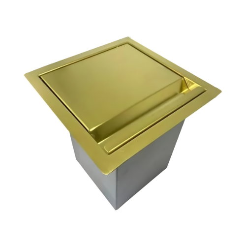 Lixeira Helena Quadrada Dourada em Aço Inox de Embutir com Tampa Articulada – Fineza