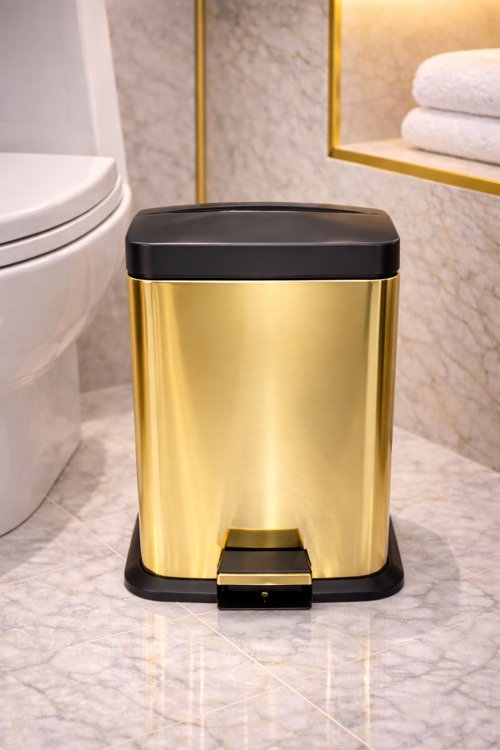 Lixeira Hera Quadrada Dourada Fosca e Preta em Aço Inox e Plástico com Pedal – Fineza