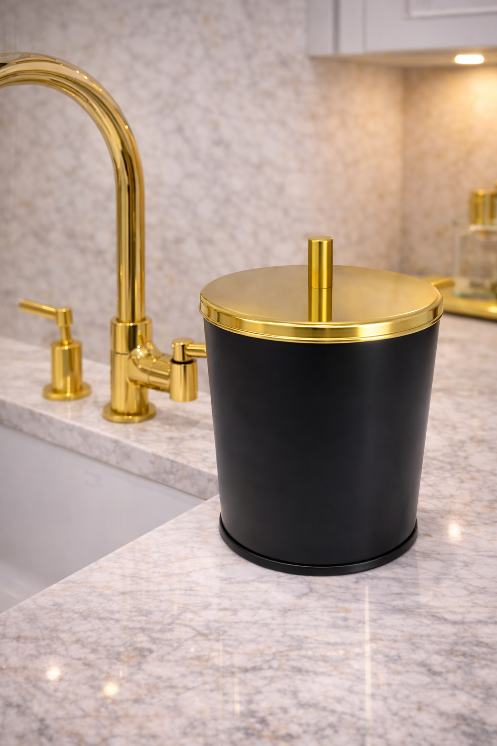 Lixeira Mathilde Preta e Dourada em Plástico e Aço Inox com Tampa Pino 5,4L – Fineza