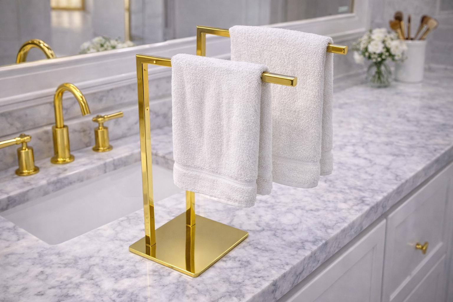 Organizando seu banheiro ou lavabo, este toalheiro, com 28cm de altura, duplo, polido e completamente revestido em nitreto de titânio dourado (PVD – Physical Vapor Deposition) de alta durabilidade e antimicrobiano, é a peça mais funcional, prática e delicada que cumpre o que promete. Além disso, possui acabamento em alto brilho metálico, sem porosidades, evitando o acúmulo de resíduos e/ou bactérias.
